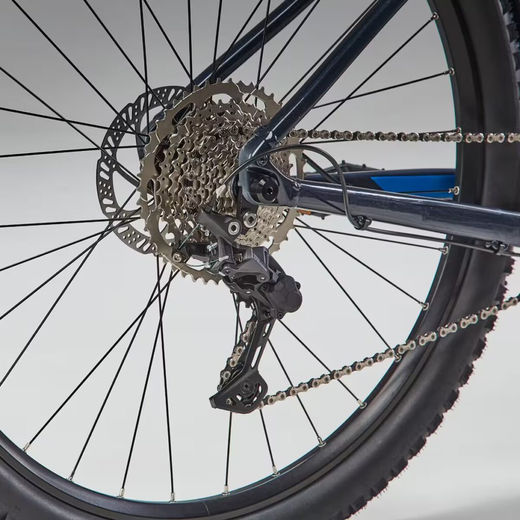 Le Rockrider EXPL 540 utilise une configuration 1×10 avec un plateau de 30 dents, compatible 32, et une cassette 11-46. Cette plage offre une polyvalence suffisante pour les montées raides comme pour les portions roulantes. Les versions S et M reprennent une longueur de manivelles adaptée : 170 mm en S, 175 mm des tailles M à XL, ce qui respecte les contraintes biomécaniques.
