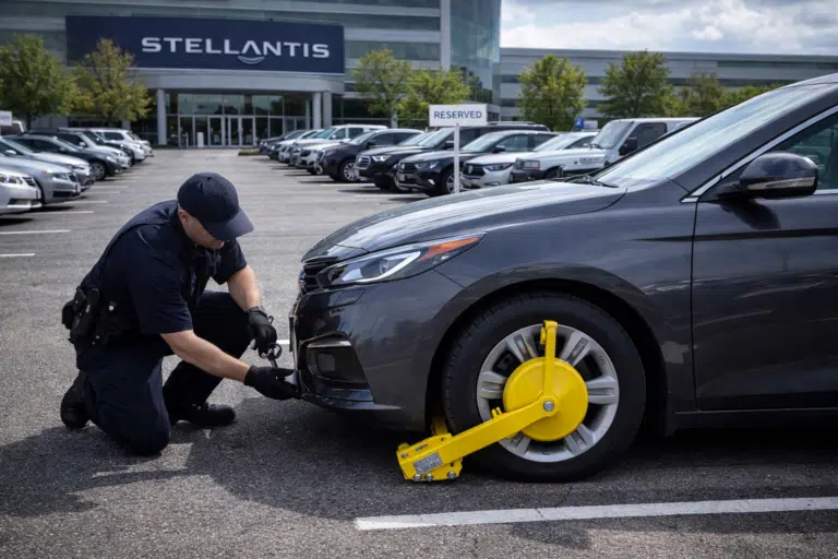 Le vaste campus d’Auburn Hills fonctionne sur un système de zones de stationnement hiérarchisées. Les emplacements les plus proches des entrées sont strictement réservés aux véhicules issus des marques du groupe Stellantis.