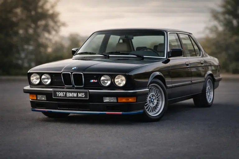 La BMW M5 E28 n’est pas une Série 5 ordinaire. Lancée entre 1985 et 1988, elle fut la première à recevoir l’emblème Motorsport, propulsée par le bloc M88/3 issu directement de la supercar M1. Ce six-cylindres de 3,5 litres développe 286 chevaux, grâce à une culasse en alliage à 24 soupapes, des papillons d’admission individuels et une injection électronique Bosch Motronic. Les performances annoncées : 0 à 100 km/h en 6,5 secondes et une vitesse de pointe de 245 km/h.